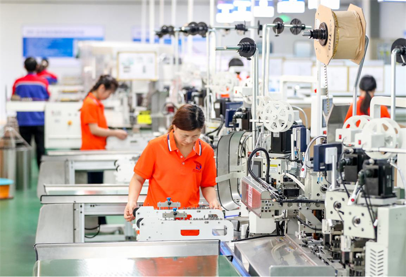 | Des employés de l'atelier de faisceaux de câbles de Daqian Electronic Technology Co., Ltd., une entreprise privée située dans la zone de développement économique de Huayingshan, à Huaying, dans la province du Sichuan (sud-ouest de la Chine), utilisaient une ligne de production intelligente pour compresser les faisceaux de câbles, le 18 avril 2025. (Qiu Haiying / Pic.people.com.cn) |