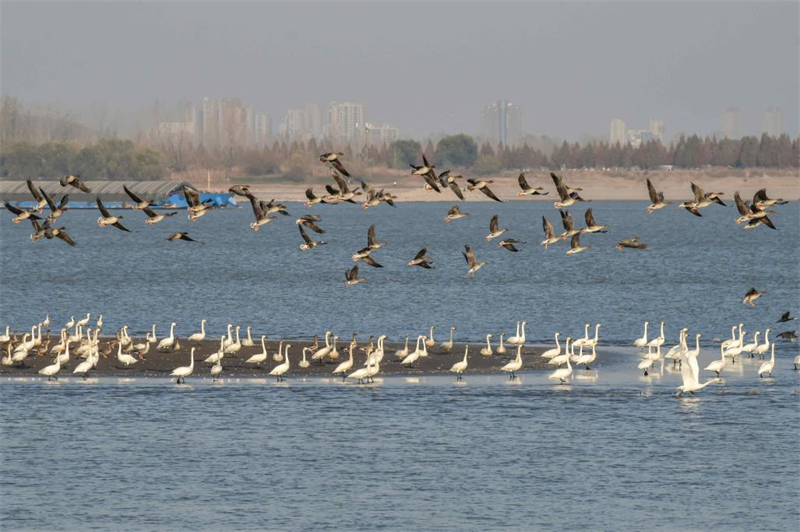 | Un groupe de cygnes et d'oies en migration se reposent sur un banc de sable du fleuve Yangtsé à Tongling, dans la province de l'Anhui (est de la Chine), le 6 décembre 2025. (Photo / Chu Zhuchuan) |