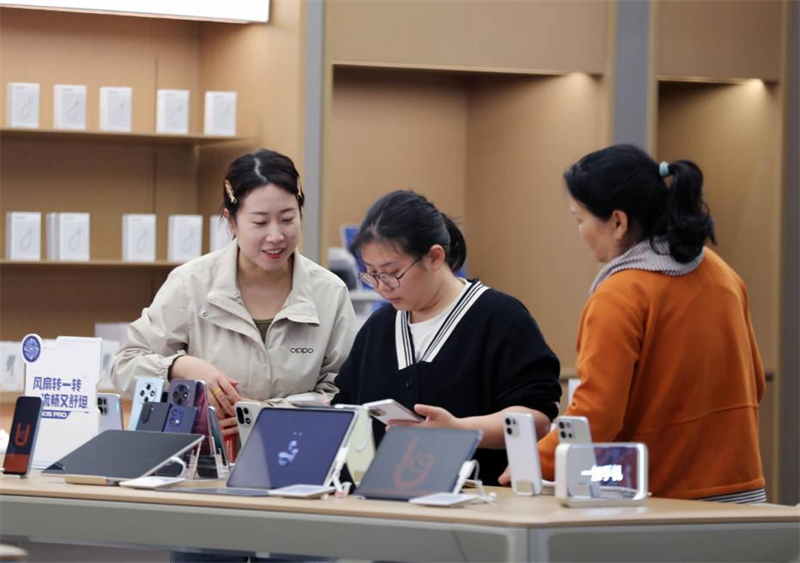 | Des consommatrices choisissent de nouveaux téléphones portables dans un centre commercial de la ville de Leshan, dans la province du Sichuan (sud-ouest de la Chine). (Photo / Li Huashi) |