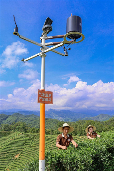 | Équipement intelligent de surveillance météorologique dans un jardin de thé agricole capturé dans une plantation de thé du comté de Cangwu de la ville de Wuzhou, dans la région autonome Zhuang du Guangxi (sud de la Chine). (Photo / Yan Guihai) |